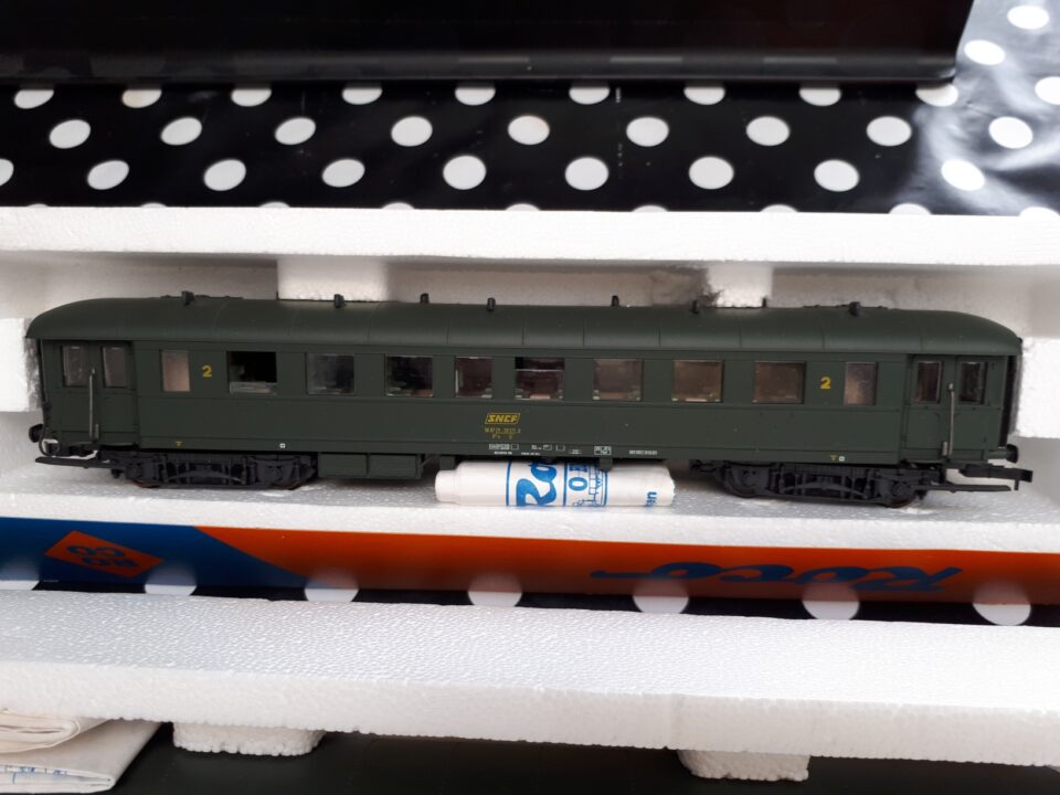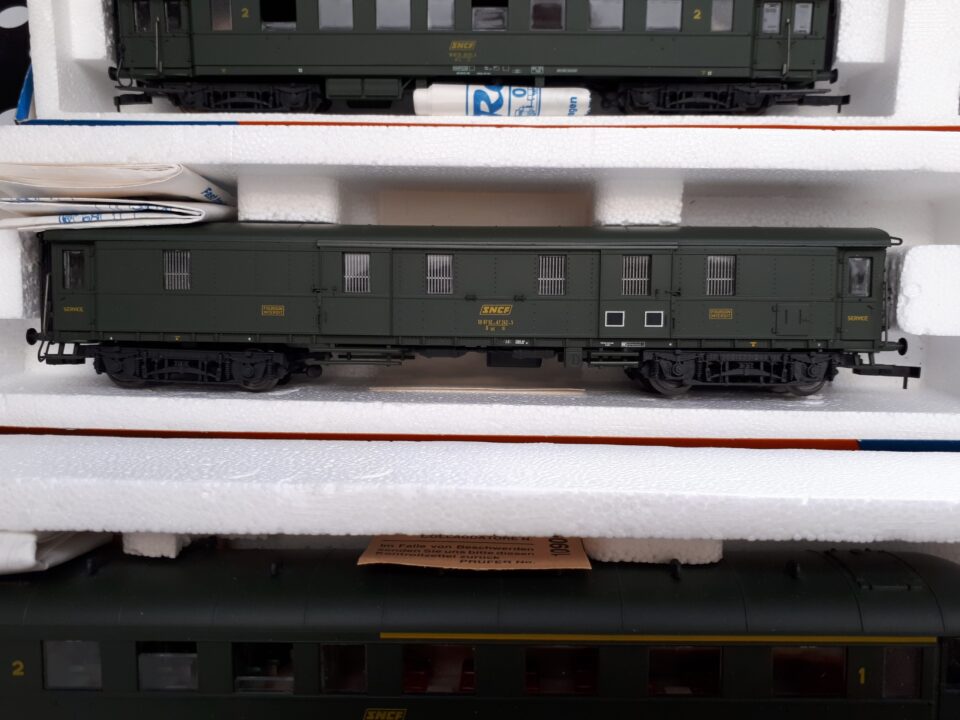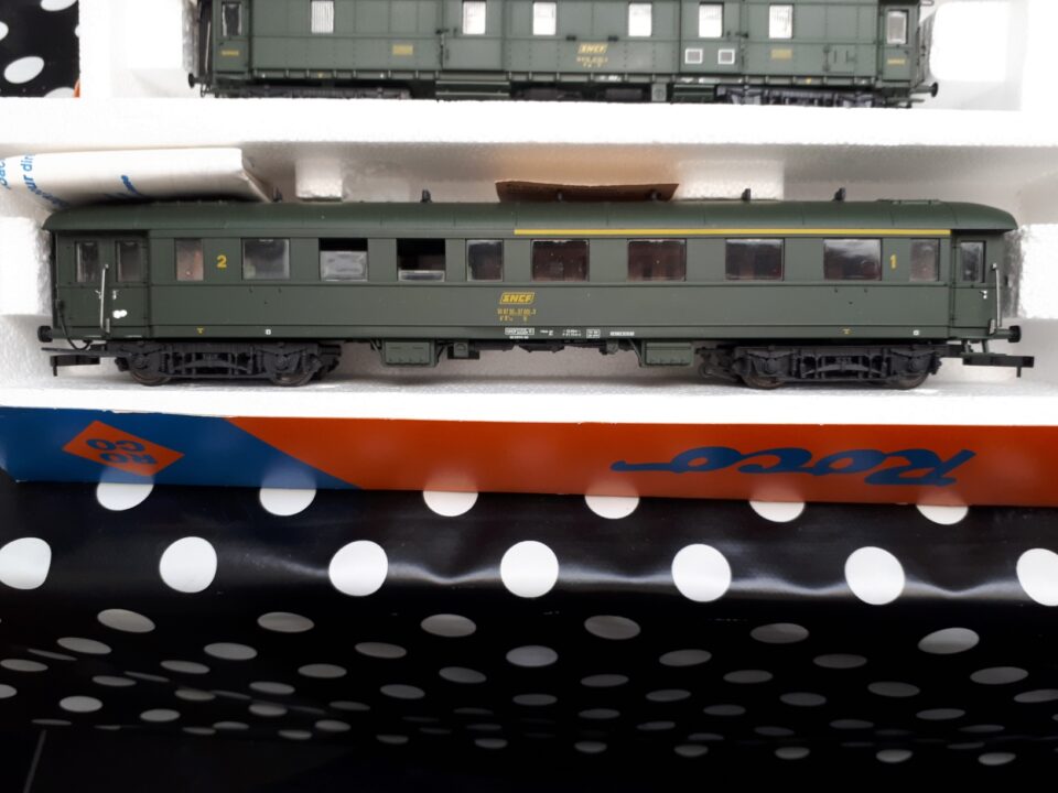 Vends un ensemble de trois voitures Bastille SNCF de Roco, 1º/2º classe, 2º classe et fourgon.