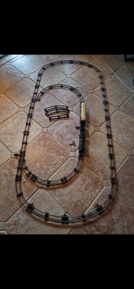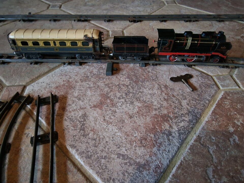 Train mécanique de mon père, année1920/1930, fonctionne bien, eclat de rouille sur un côté du wagon, locomotive et remorque à charbon très bon état, il se remonte avec la clé.