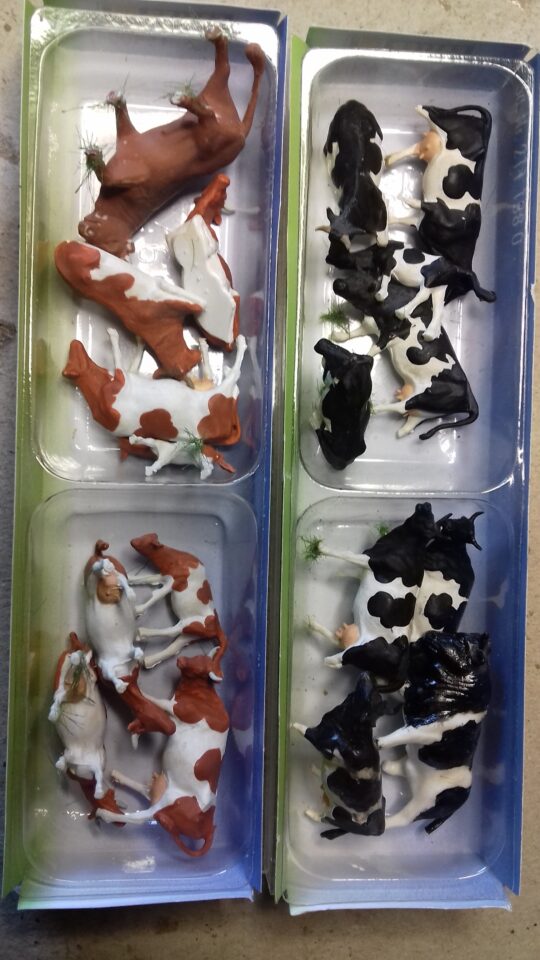 Faller en BO ref154003 8 vachestachetées de noir (5 ont une patte cassée a mi hauteur) ref154004 8 vaches tachetées de brun + 1 taureau brun) reglement par cheque port en sus 5,5€