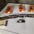 train de secours comprenant Jouef grue Cockeril 85 t dans son coffret ref M 663 complet + Fleischmann wagon à bogies transformé en porte fleche ref52625 + MMM RG 1 fourgon MT ref1162 + MMM RG 1 voiture dortoir ref1142…